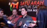 Dari Seniman Untuk 01. Ketua TKN Jokowi-Maruf Amin, Erick Thohir menjawab pertanyaan wartawan usai membuka Pameran Satu Arah untuk Satu Indonesia Maju di Jakarta, Ahad (10/2/2019). (FOTO : Republika/ Wihdan)