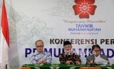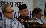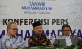 Sekertaris PP Muhammadiyah Abdul Mu'ti (tengah) bersama Ketua PP Muhammadiyah Bahtiar Effendy (kanan) dan Hajriyanto Y Thohari (kiri) memberikan keterangan terkait pelaksanaan Tanwir Muhammadiyah di Gedung Dakwah Muhammadiyah, Jakarta, Senin (11/2). (FOTO : Republika/Prayogi)