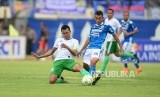 PERSIB PERSIWA. Gelandang Persiwa Wamena dan gelandang Persib Bandung Abdul Aziz beduel pada pertandingan leg kedua Piala Indonesia babak 32 besar antara Persib Bandung melawan Persiwa Wamena di Stadion si Jalak Harupat, Soreang, Senin (11/2). (FOTO : Yogi Ardhi/Republika)