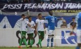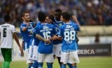 Striker Persib Bandung Ezechiel Ndouasel bersama timnya merayakan gol kedua Persib ke gawang Persiwa Wamena pada pertandingan leg kedua Piala Indonesia babak 32 besar antara Persib Bandung melawan Persiwa Wamena di Stadion si Jalak Harupat, Soreang, Senin (11/2). (FOTO : Yogi Ardhi/Republika)