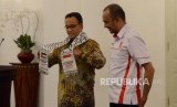 Pelepasan Relawan MER-C. Gubernur DKI Jakarta Anies Baswedan bersama Presidium Medical Emergency Rescue Committe (MER-C) Sarbini Abdul Murad memberikan sambutan saat pelepasan relawan MER-C di gedung Balaikota Jakarta, Jumat (22/2). (FOTO : Republika/Putra M. Akbar)