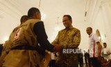 Pelepasan Relawan MER-C. Gubernur DKI Jakarta Anies Baswedan bersama Presidium Medical Emergency Rescue Committe (MER-C) Sarbini Abdul Murad menyalami relawan saat acara pelepasan relawan MER-C di gedung Balaikota Jakarta, Jumat (22/2). (FOTO : Republika/Putra M. Akbar)