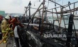 Pasca Kebakaran Kapal Muara Baru. Petugas pemadam kebakaran melakukan pendinginan terhadap kapal yang telah habis terbakar di Pelabuhan Muara Baru, Jakarta, Ahad (24/2). (FOTO : Republika/Putra M. Akbar)