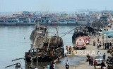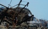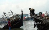 Pasca Kebakaran Kapal Muara Baru. Warga melihat kondisi kapal yang telah habis terbakar di Pelabuhan Muara Baru, Jakarta, Ahad (24/2). (FOTO : Republika/Putra M. Akbar)