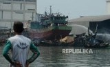 REPUBLIKA.CO.ID, JAKARTA -- Warga melihat kondisi kapal yang telah habis terbakar di Pelabuhan Muara Baru, Jakarta, Ahad (24/2).