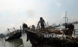 Pasca Kebakaran Kapal Muara Baru. Warga berusaha melakukan pendinginan terhadap kapal yang telah habis terbakar di Pelabuhan Muara Baru, Jakarta, Ahad (24/2). (FOTO : Republika/Putra M. Akbar)