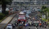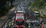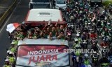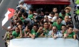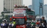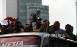 REPUBLIKA.CO.ID, JAKARTA -- Rombongan pemain, pelatih, dan ofisial timnas Indonesia U-22 konvoi dengan bus terbuka saat berangkat menuju Istana Merdeka , Kamis (28/2).