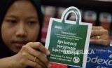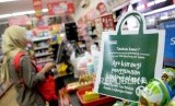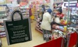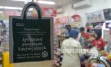 Kantong Plastik. Pramuniaga memasang informasi Kurangi Kantong Plastik di salah satu mini market di Kawasan Jagakarsa,Jakarta Jumat (1/3). (FOTO : Republika/Prayogi)