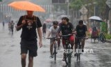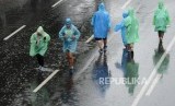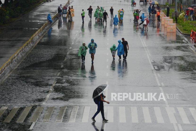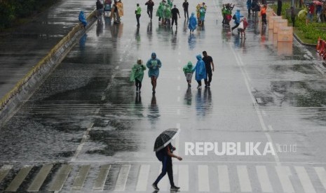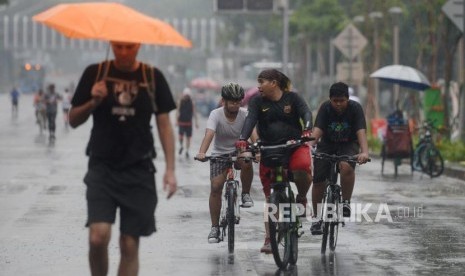 Olahraga Saat Hujan. Warga berolahraga saat hujan pada hari bebas kendaraan bermotor di Jalan Jenderal Sudirman, Senayan, Jakarta, Ahad (3/3). (FOTO : Republika/Putra M. Akbar)