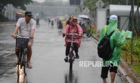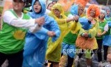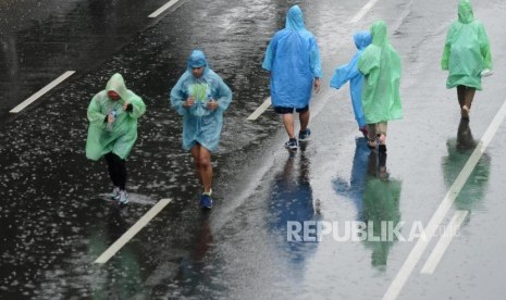 REPUBLIKA.CO.ID, JAKARTA -- Warga berolahraga menggunakan jas hujan pada hari bebas kendaraan bermotor di Jalan Jenderal Sudirman, Senayan, Jakarta, Ahad (3/3).