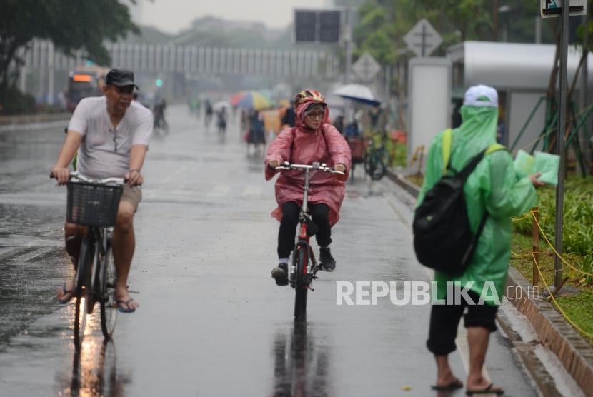 Meski dalam guyuran hujan, namun warga tetap antusias datang untuk melakukan olahraga pada hari bebas kendaraan bermotor.