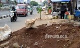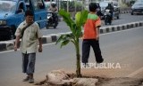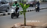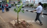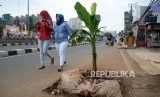 REPUBLIKA.CO.ID, DEPOK -- Warga melintas di dekat galian yang ditanami pohon pisang di kawasan jalan Margonda, Depok, Senin (4/3).