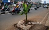 Pohon pisang sengaja ditanam warga di bekas lubang galian, sebagai bentuk protes atas kerusakan jalan yang tak kunjung diperbaiki.