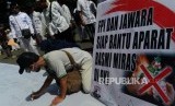 Aksi Dukung Pelepasan Saham Bir. Sejumlah massa PA 212 dan Jawara Betawi membubuhkan tanda tangan saat melakukan aksi di Jalan kebon Sirih, Jakarta, Jumat (8/3). (FOTO : Republika/Putra M. Akbar)