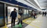 Uji Coba Publik MRT. Penumpang menunggu kereta MRT saat uji cooba publik pengoperasian MRT fase I Koridor Lebak Bulus-Bundaran HI di Jakarta, Selasa (12/3). (FOTO : Republika/Putra M. Akbar)