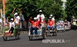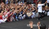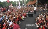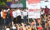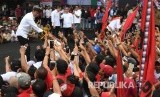 REPUBLIKA.CO.ID, BANYUWANGI -- Calon Presiden petahana nomor urut 01 Joko Widodo (kanan) menyapa pendukung saat kampanye terbuka di Banyuwangi, Jawa Timur, Senin (25/3/2019).