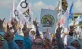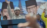 Para pendukung calon Presiden-Wakil Presiden nomor urut 02 Prabowo Subianto-Sandiaga Uno meneriakkan yel-yel dalam kampanye terbuka di lapangan Kompyang Sujana, Denpasar, Selasa (26/3). (FOTO : Antara/Nyoman Budhiana)