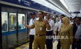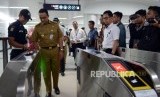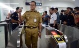 Gubernur DKI Jakarta Anies Baswedan usai menaiki kereta MRT di Stasiun MRT Bundaran HI, Jakarta, Senin (1/4). (FOTO : Republika/Putra M. Akbar)