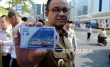 Gubernur DKI Jakarta Anies Baswedanvmemperlihatkan kartu Jak Lingko yang sudah terintegrasi dengan MRT di kawasan Bundaran HI, Jakarta, Senin (1/4). (FOTO : Republika/Putra M. Akbar)