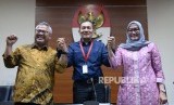Wakil Ketua KPK Saut Situmorang (tengah), Ketua KPU Arief Budiman (kiri) dan Komisioner KPU Ida Novida Ginting Manik (kanan) berjabat tangan usai memberikan keterangan pers di kantor KPK, Jakarta, Senin (8/4). (FOTO : Republika/Prayogi)