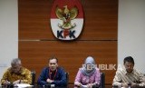 Wakil Ketua KPK Saut Situmorang (dua kanan), Ketua KPU Arief Budiman (dua kiri), Komisioner KPU Ida Novida Ginting Manik (kanan) dan Deputi Pencegahan KPK Pahala Nainggolan memberikan keterangan pers di kantor KPK, Jakarta, Senin (8/4). (FOTO : Republika/Prayogi)