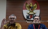 Wakil Ketua KPK Saut Situmorang bersama Ketua KPU Arief Budiman memberikan keterangan pers di kantor KPK, Jakarta, Senin (8/4). (FOTO : Republika/Prayogi)