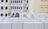 Petugas Panitia Pemilihan Kecamatan (PPK) Pademangan menempelkan stiker pada kotak suara di GOR Pademangan, Jakarta, Senin (8/4/2019). (FOTO : Antara/Hafidz Mubarak A)