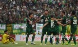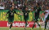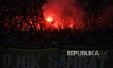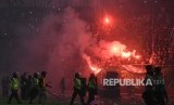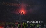 REPUBLIKA.CO.ID, SURABAYA -- Sejumlah petugas keamanan berjaga-jaga ketika suporter Persebaya Surabaya menyalakan cerawat (flare) dan melmpar botol minuman saat akhir laga final leg 1 Piala Presiden 2019 antara Persebaya Surabaya vs Arema FC di Gelora Bung Tomo, Surabaya, Jawa Timur, Selasa (9/4/2019). Pertandingan tersebut berakhir imbang dengan skor 2-2.