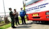 Jamin Pasokan BBM Pemilu Aman. Direktur Pengolahan Pertamina, Budi Santoso Syarif (kanan) berbincang dengan aparat keamanan usai apel siaga kesiapan pengamanan dan distribusi BBM dan LPG di Terminal BBM Plumpang, Jakarta, kamis (11/4/2019). (FOTO : Republika/ Wihdan)