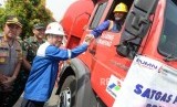 Jamin Pasokan BBM Pemilu Aman. Direktur Pengolahan Pertamina, Budi Santoso Syarif (kedua kanan) melepas truk angkut bbm usai apel siaga kesiapan pengamanan dan distribusi BBM dan LPG di Terminal BBM Plumpang, Jakarta, kamis (11/4/2019). (FOTO : Republika/ Wihdan)