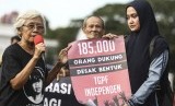 Aktivis Jaringan Solidaritas Korban untuk Keadilan Sumarsih (kiri) berpose dengan istri penyidik senior Komisi Pemberantasan Korupsi (KPK) Novel Baswedan, Rina Emilda (tengah) dan aktivis lainnya seusai aksi Kamisan ke-581 di depan Istana Merdeka, Jakarta, Kamis (11/4). (FOTO : Antara/Nova Wahyudi)