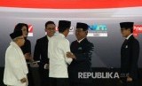 Pasangan capres nomor urut 01 Joko Widodo berjabat tangan dengan capres nomor urut 02 Prabowo Subianto sebelmum mengikuti debat kelima Pilpres 2019 di Hotel Sultan, Jakarta, Sabtu (13/4/2019). (FOTO : Republika/Prayogi)