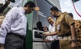 Gubernur DKI Jakarta Anies Rasyid Baswedan dan PT Transjakarta melakukan prauji coba bus listrik dari Balai Kota sampai Bundaran HI, Senin (29/4). (FOTO : Republika/Mimi Kartika )