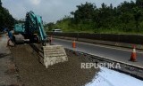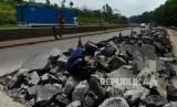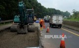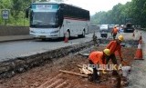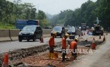 REPUBLIKA.CO.ID, PURWAKARTA -- Pekerja saat menyelesaikan perbaikan Jalan Tol Cipularang KM 106, Purwakarta, Jawa Barat, Senin (29/4). Perbaikan ruas jalan tol yang biasa dilalui oleh para pemudik itu dilakukan untuk persiapan menjelang mudik lebaran.