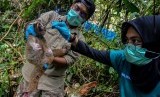 Tim medis International Animal Rescue (IAR) mengecek kondisi kesehatan seekor Kukang Jawa (Nycticebus javanicus) sebelum dilepasliarkan ke tempat Suaka Margasatwa Gunung Sawal (SMGS), Kabupaten Ciamis, Jawa Barat, Jumat (3/5/2019). (FOTO : Antara/Adeng Bustomi)