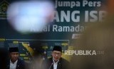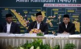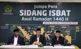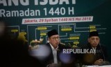 Sidang Isbat Ramadhan 1440H. Menteri Agama Lukman Hakim Saifuddin (tengah) didampingi Ketua Komisi VIII Ali Taher (kiri), dan Ketua MUI Abdullah Jaidi (kanan) menyampaikan hasil Sidang Isbat penentuan awal Ramadan 1440 Hijriah di Kementerian Agama, Jakarta, Ahad (5/5/2019). (FOTO : Republika/ Wihdan)