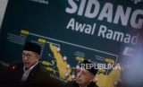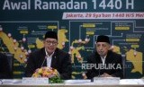 Sidang Isbat Ramadhan 1440H. Menteri Agama Lukman Hakim Saifuddin (kiri) dan Ketua MUI Abdullah Jaidi (kanan) menyampaikan hasil Sidang Isbat penentuan awal Ramadan 1440 Hijriah di Kementerian Agama, Jakarta, Ahad (5/5/2019). (FOTO : Republika/ Wihdan)