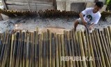 Pekerja menata bambu berisi lemang terbuat dari ketan, sebelum dibakar di Desa Tumpok Teungoh, Lhokseumawe, Aceh. (FOTO : Antara/Rahmad)