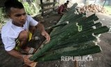 Pekerja mengisi beras dan air santan kelapa kedalam bambu sebagai Lemang sebelum dibakar di Desa Tumpok Teungoh, Lhokseumawe, Aceh. (FOTO : Antara/Rahmad)