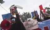Sejumlah massa yang tergabung dalam Emak-emak Gerakan Rakyat Anti Pemilu Curang melakukan aksi keprihatinan di depan Kantor KPU Jawa Barat, Kota Bandung, Jumat (10/5). (FOTO : Abdan Syakura)