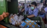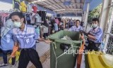 Sejumlah petugas kebersihan mengangkut sampah di Jembatan Multiguna (JPM) Skybridge, Tanah Abang, Jakarta Pusat, Selasa (14/5). (FOTO : Republika/Fakhri Hermansyah)