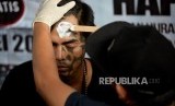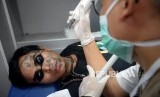 Anak punk dioleskan bius lokal ketika melakukan proses penghapusan tato saat memanfaatkan layanan hapus tato gratis di kolong jembatan stasiun tebet, Jakarta, Sabtu (18/5). (FOTO : Republika/Prayogi)