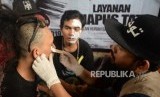 Anak punk melakukan proses penghapusan tato saat memanfaatkan layanan hapus tato gratis di kolong jembatan stasiun tebet, Jakarta, Sabtu (18/5). (FOTO : Republika/Prayogi)