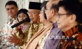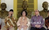 Putra-Putri keturunan Panitia Sembilan Salahuddin Wahid, Meutia Farida Hatta Swasono, Agustanzil Sjahroezah (dari kiri) saat memberikan keterangan saat konferensi pers di Gedung Museum Perumusan Naskah Proklamasi, Jakarta, Senin (20/5). (FOTO : Republika/Putra M. Akbar)