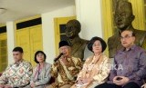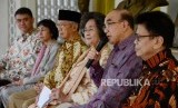 Putra-Putri keturunan Panitia Sembilan Roy Rahajasa Yamin, SR Handini B Maramis, Salahuddin Wahid, Meutia Farida Hatta Swasono, Agustanzil Sjahroezah (dari kiri) memberikan keterangan saat konferensi pers di Gedung Museum Perumusan Naskah Proklamasi, Jakarta, Senin (20/5). (FOTO : Republika/Putra M. Akbar)