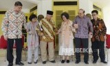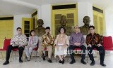 Putra-Putri keturunan Panitia Sembilan Roy Rahajasa Yamin, SR Handini B Maramis, Salahuddin Wahid, Meutia Farida Hatta Swasono, Agustanzil Sjahroezah dan Rohadi Subardjo (dari kiri) memberikan keterangan saat konferensi pers di Gedung Museum Perumusan Naskah Proklamasi, Jakarta, Senin (20/5). (FOTO : Republika/Putra M. Akbar)
