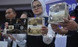 Kepala Badan Pengawas Obat dan Makanan Republik Indonesian (BPOM-RI) Penny K. Lukito (ketiga kanan) memegang barang bukti temuan sejumlah makanan dan kopi dalam kemasan yang dinilai diedarkan secara ilegal di Jakarta, Senin (20/5). (FOTO : Republika/Edwin Dwi Putranto)