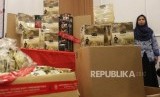 Kepala Badan Pengawas Obat dan Makanan Republik Indonesian (BPOM-RI) Penny K. Lukito memegang barang bukti temuan sejumlah makanan dan kopi dalam kemasan yang dinilai diedarkan secara ilegal di Jakarta, Senin (20/5). (FOTO : Republika/Edwin Dwi Putranto)