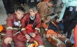 Seorang petugas pemadam kebakaran yang lemas ditolong rekannya saat peristiwa kebakaran di Pasar Kosambi, Kota Bandung, Senin (20/1). (FOTO : Republika/Edi Yusuf)