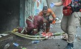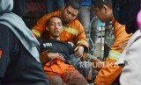 Seorang petugas pemadam kebakaran yang lemas ditolong rekannya dan petugas PMI saat peristiwa kebakaran di Pasar Kosambi, Kota Bandung, Senin (20/1). (FOTO : Republika/Edi Yusuf)